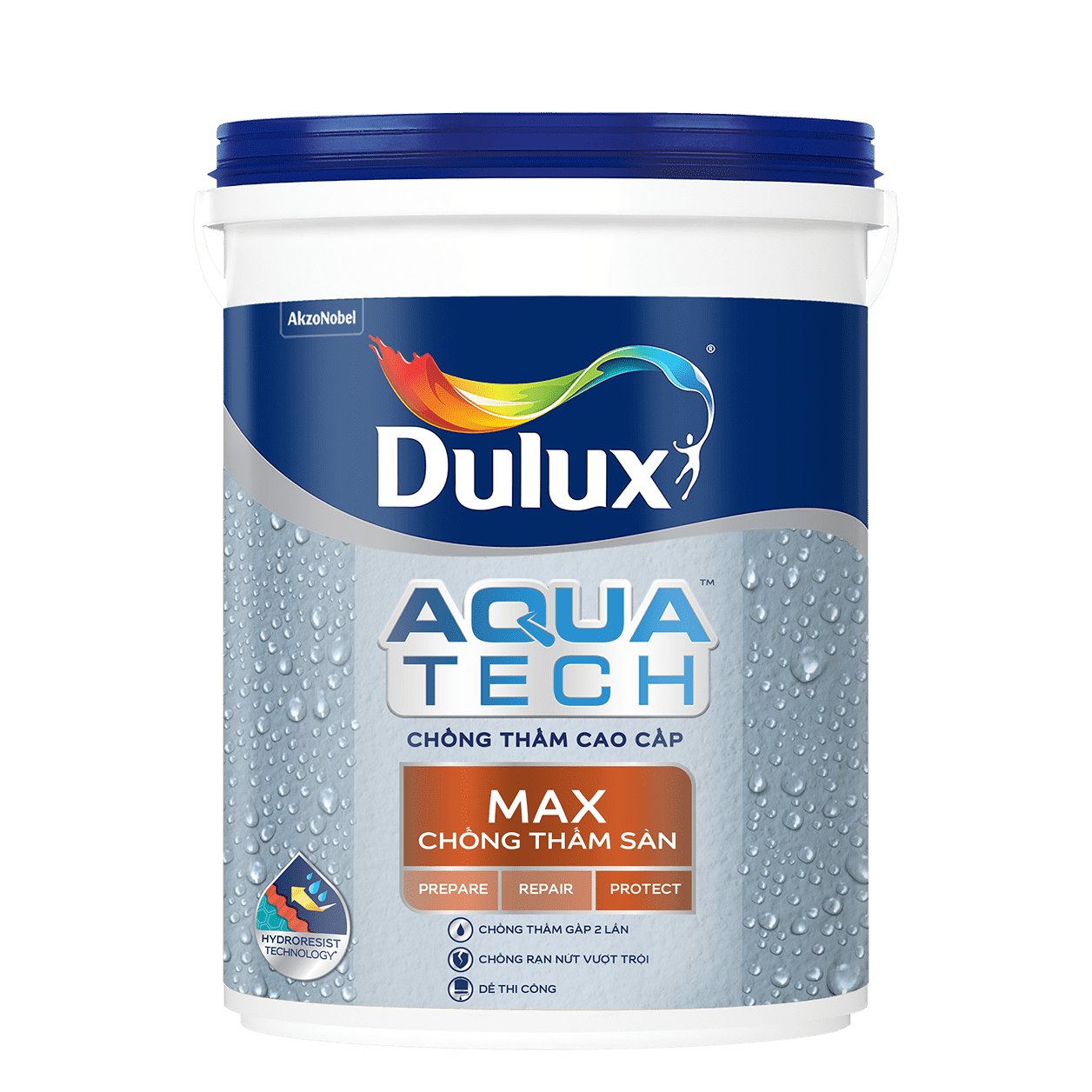 Dulux AquatechTM Max Horizontal Waterproofing là chất chống thấm sàn cao cấp siêu bền được cấu tạo bởi các phân tử nhựa có liên kết chặt chẽ và vô cùng cứng chắc để tạo một lớp màng bảo vệ ngăn chặn nước thẩm thấu qua bề mặt. Công nghệ Hydroresist đột phá cho khả năng chống thấm siêu việt, với màng chống thấm dày, đanh chắc và siêu co giãn giúp ngăn chặn thấm nước và mang tới hiệu quả bảo vệ lâu dài.