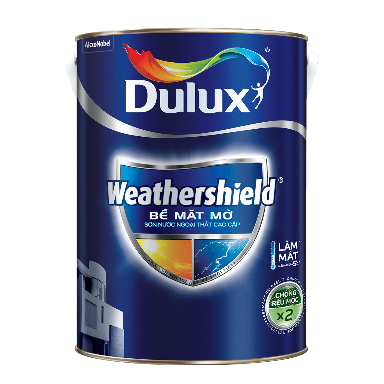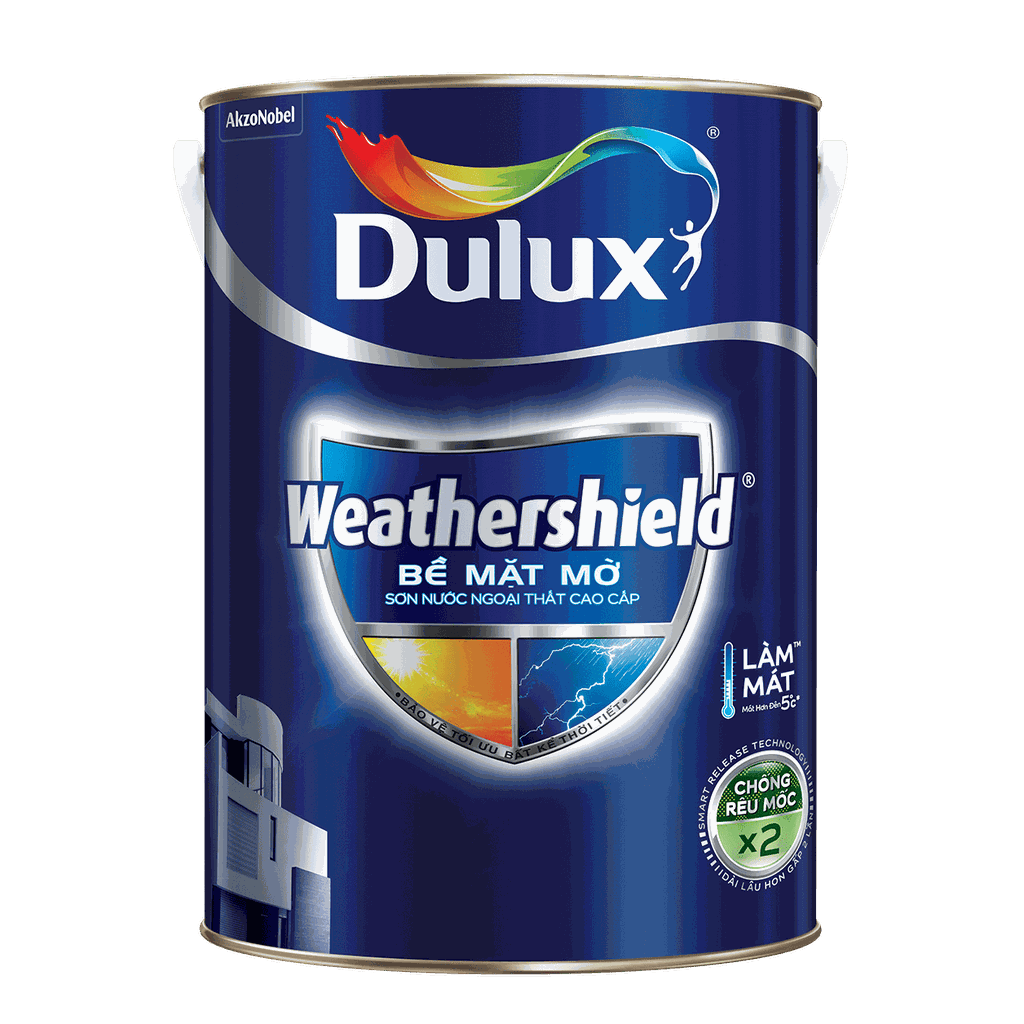 Sơn nước ngoại thất cao cấp mang lại vẻ đẹp hiện đại cho ngôi nhà. Công thức cải tiến mới của Dulux Weathershield với công nghệ đột phá Smart Release với các hạt phân tử có khả năng giải phóng thông minh, hoạt động linh hoạt và bám chắc trên bề mặt sơn, ngăn chặn hiệu quả sự phát triển của rêu mốc dài lâu hơn gấp 2 lần so với các loại sơn ngoại thất cao cấp khác trên thị trường, giúp bảo vệ màng sơn bền đẹp lâu hơn.