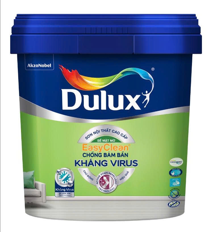 Dulux EasyClean Chống Bám Bẩn Kháng Virus là sản phẩm sơn nội thất cao cấp được trang bị công nghệ vượt trội Silver Ion Technology không chỉ giúp ngăn ngừa sự phát triển của vi khuẩn trên bề mặt màng sơn mà còn giúp chống lại các loại virus có hại (*). Ngoài ra, sản phẩm còn duy trì công nghệ tiên tiến Chống Bám Bẩn Chủ Động - Active Stain Repellent Technology, chủ động ngăn ngừa các vết bẩn thấm sâu vào màng sơn giữ cho tường nhà luôn sạch đẹp.