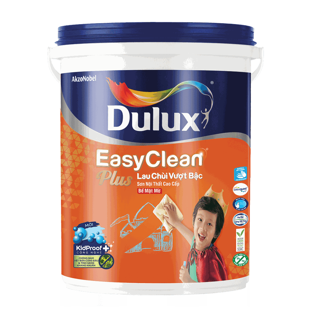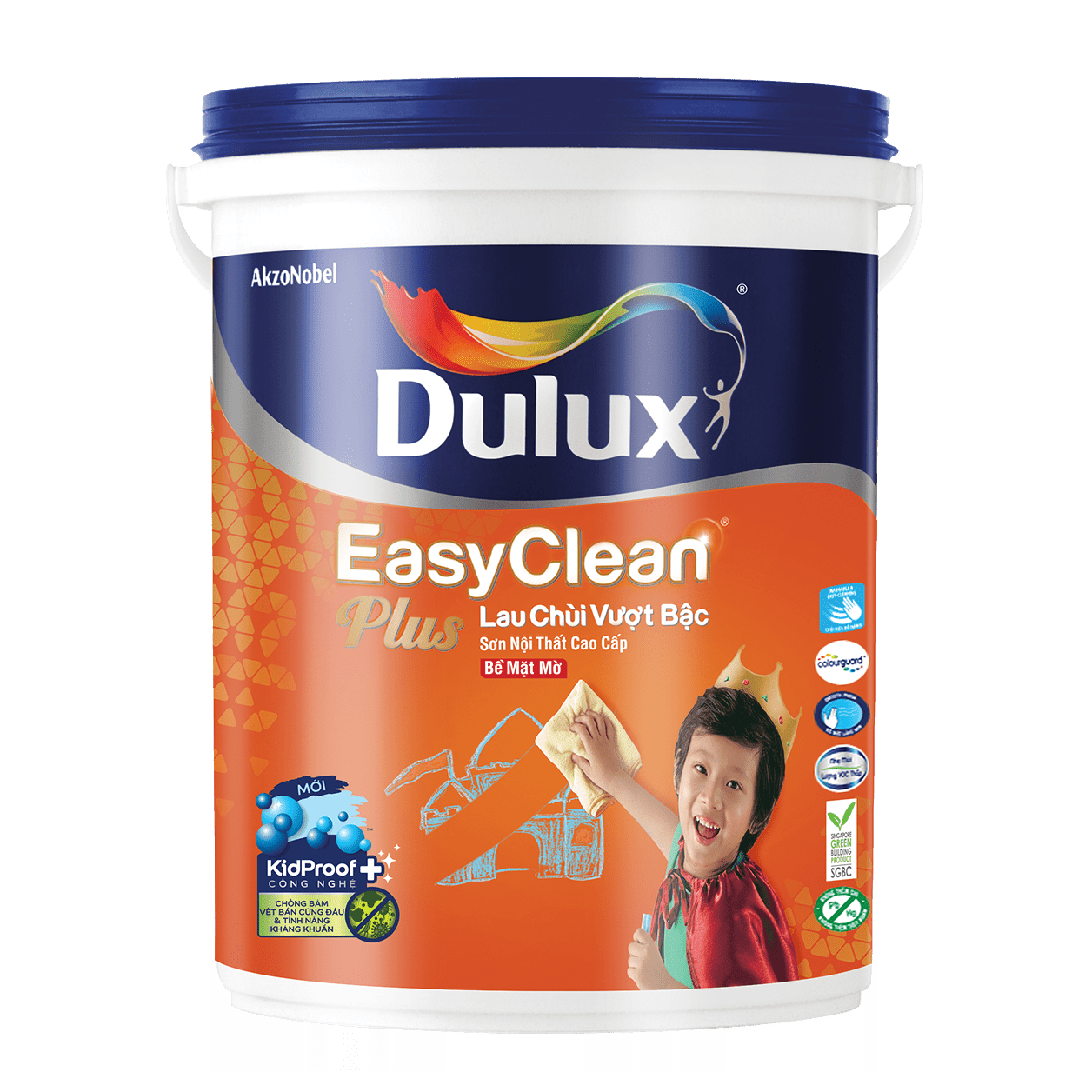 Dulux EasyClean Lau Chùi Vượt Bậc- Bề mặt Mờ là sơn nội thất cao cấp giúp giữ tường nhà bạn luôn sạch đẹp hơn với các tính năng: Công nghệ KidProof giúp chống bám vết bẩn cứng đầu Tính năng kháng khuẩn (*) Công nghệ Colourguard giúp giữ màu sắc luôn tươi mới Bề Mặt Láng Mịn Nhẹ mùi, lượng VOC thấp Đạt chứng nhận xanh của tổ chức Singapore Green Building Product (SGBC) Không thêm chì, không thêm Thủy Ngân (*) Tính năng kháng khuẩn được kiểm nghiệm trong phòng thí nghiệm bởi tổ chức uy tín TUV SUD tại Singapore theo tiêu chuẩn JIS Z 2801:2012.