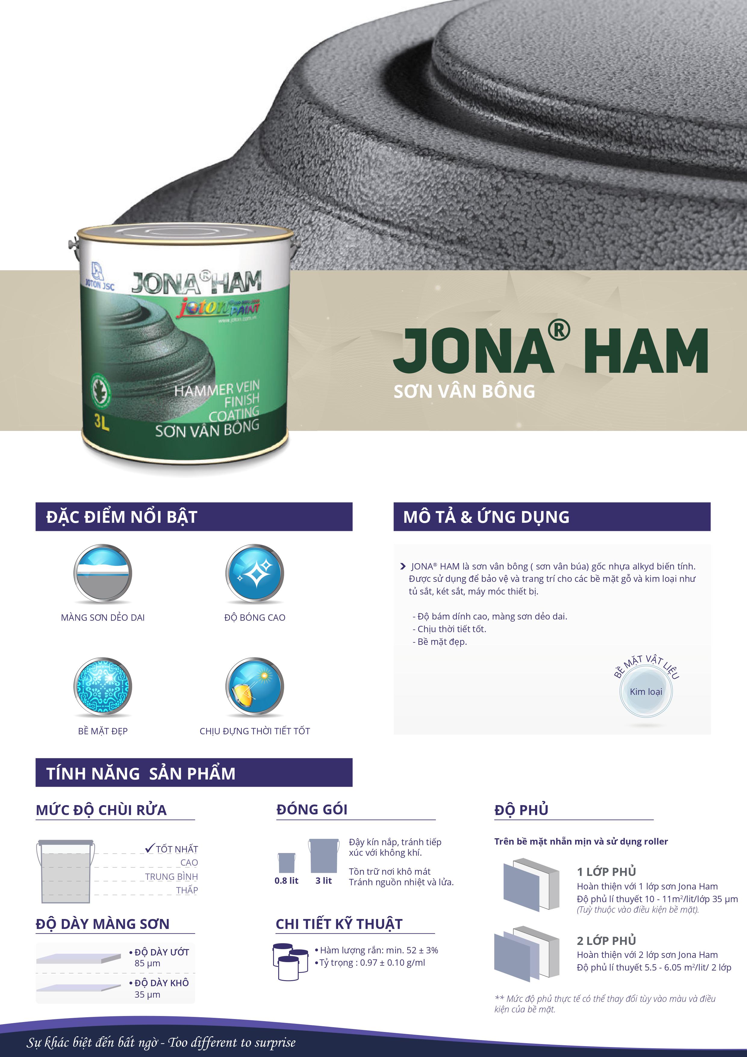 Sơn vân bông Jona Ham là sơn vân búa gốc nhựa Alkyd biến tính. Được sử dụng để bảo vệ và trang trí cho các bề mặt gỗ và kim loại như tủ sắt, két sắt, máy móc thiết bị.